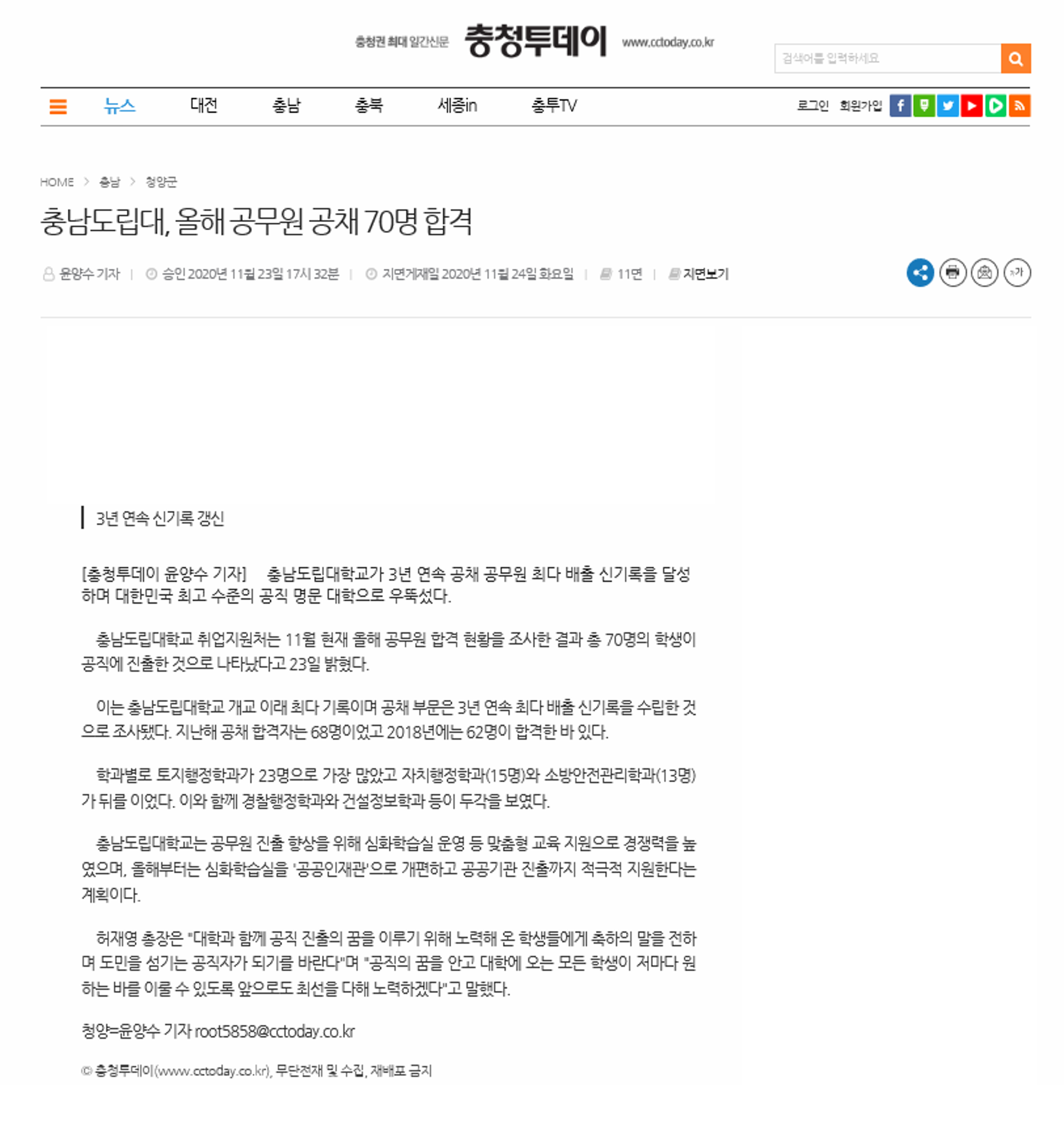 [언론보도] 충남도립대, 올해 공무원 공채 70명 합격
