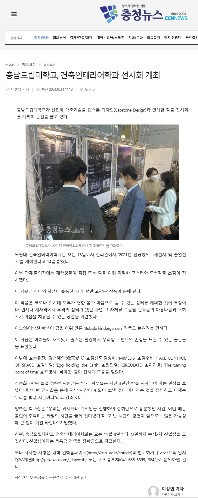 2021_10_14 충청뉴스_ 건축인테리어학과가 산업체 애호기술을 캡스톤 디자인 (Capstone Design)과 연계한 작품 전시회를 개최해 눈길을 끌고 있다.