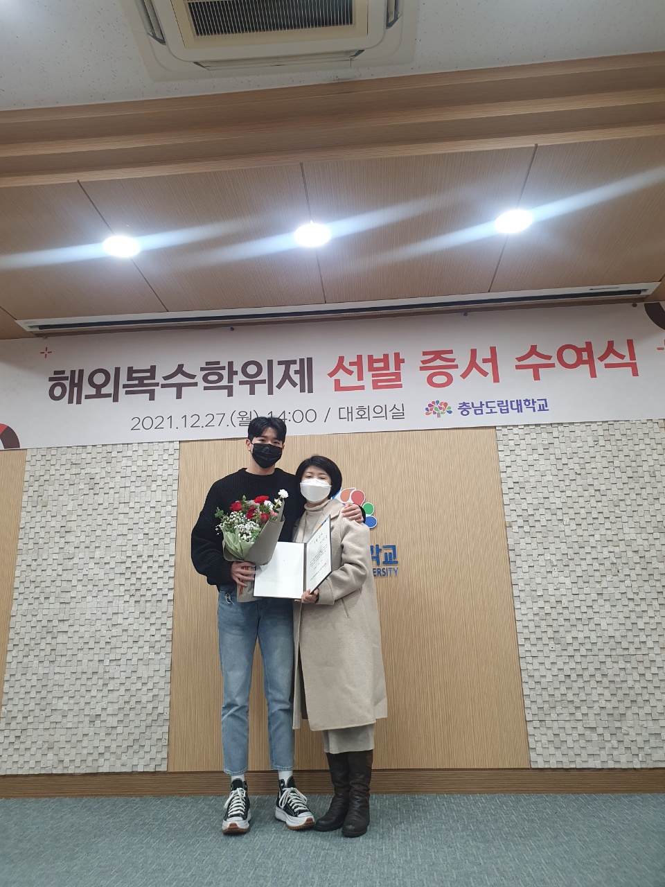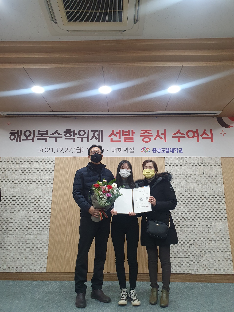 충남도립대는 지난 27일 대학 대회의실에서 김용찬 총장을 비롯한 복수학위제 참여 학생과 학부모, 교직원 등이 참석한 가운데 ‘2022년 해외복수학위제 선발 증서 수여식’을 개최했다.
