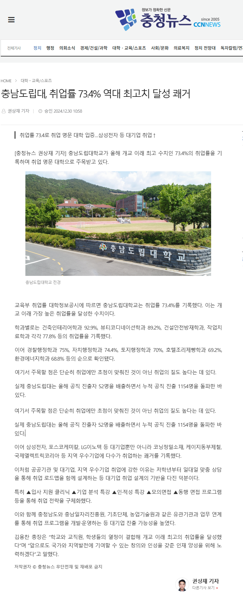 교육부 취업률 대학정보공시에 따르면 충남도립대학교는 취업률 73.4%를 기록했다. 이는 개교 이래 가장 높은 취업률을 달성한 수치이다.