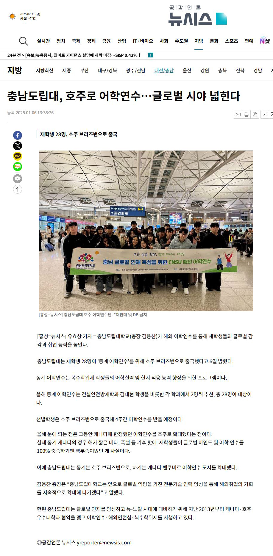 충남도립대는 재학생 28명이 "동계 어학연수"를 위해 호주 브리즈번으로 출국했다고 6일 밝혔다.