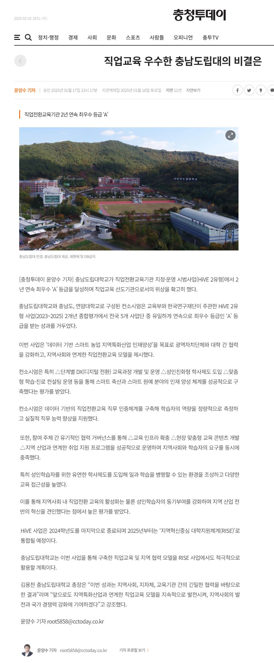 직업전환교육기관 2년 연속 최우수 등급"A"_충청투데이