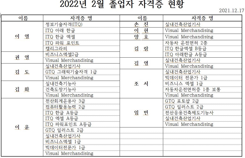 2022년 2월 졸업생들의 자격증 현황을 공지합니다.