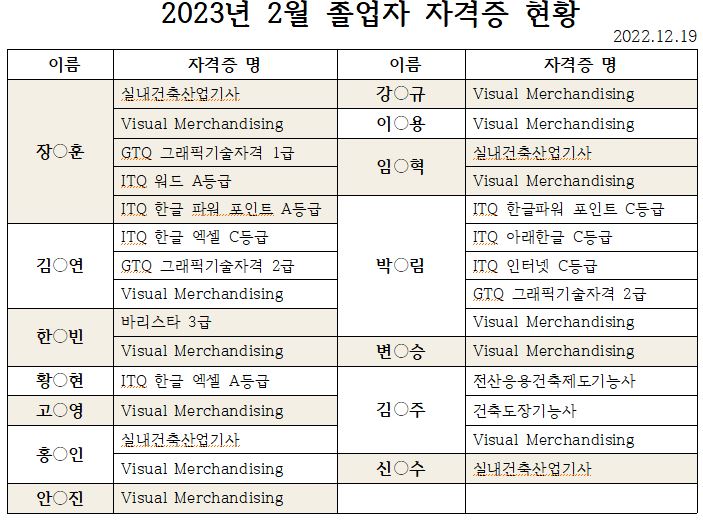 2023년 2월 졸업생들의 자격증 현황을 공지합니다.