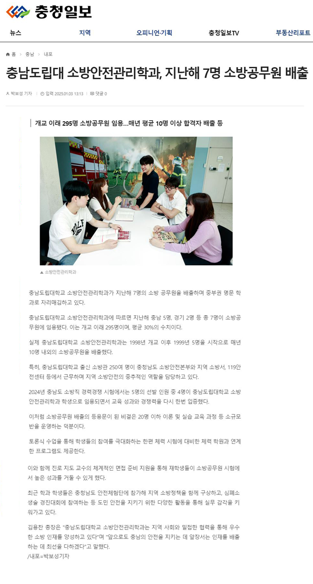 충남도립대학교 소방안전관리학과 졸업생 30% 소방공무원 임용