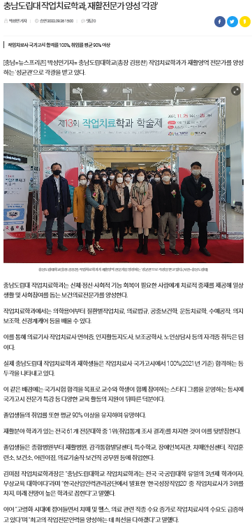 김미점 작업치료학과장은 “충남도립대학교 작업치료학과는 전국 국·공립대학 유일의 3년제 학과이자, 무상교육 대학이다”라며 “한국산업인력관리공단에서 발표한 ‘한국성장직업20’ 중 작업치료사가 3위를 차지, 미래 전망이 높은 학과로 꼽힌다”고 말했다.