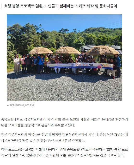 이번 프로그램은 고령화 사회에 대응하기 위해 충남도립대학교가 추진하는 '효행 봉양 프로젝트'의 일환으로, 청년세대와 노인이 함께 효를 실천하며 상호작용하는 것을 목표로 한다.