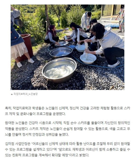 특히, 작업치료학과 학생들은 노인들의 신체적, 정신적 건강을 고려한 체험형 활동으로 스카프 제작 및 문화나들이 프로그램을 운영했다.