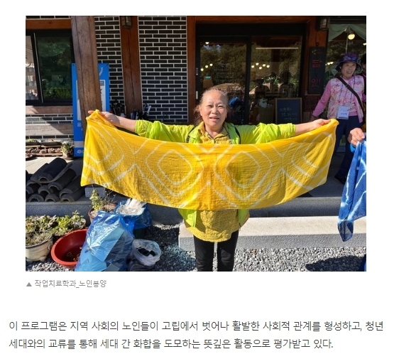참여한 노인들은 건강차 시음으로 시작해, 직접 손수 스카프를 물들이며 자신만의 창의적인 작품을 완성했다. 스카프 제작은 노인들이 손쉽게 참여할 수 있는 활동으로, 색을 고르고 무늬를 만들며 정서적 안정감과 성취감을 높였다.