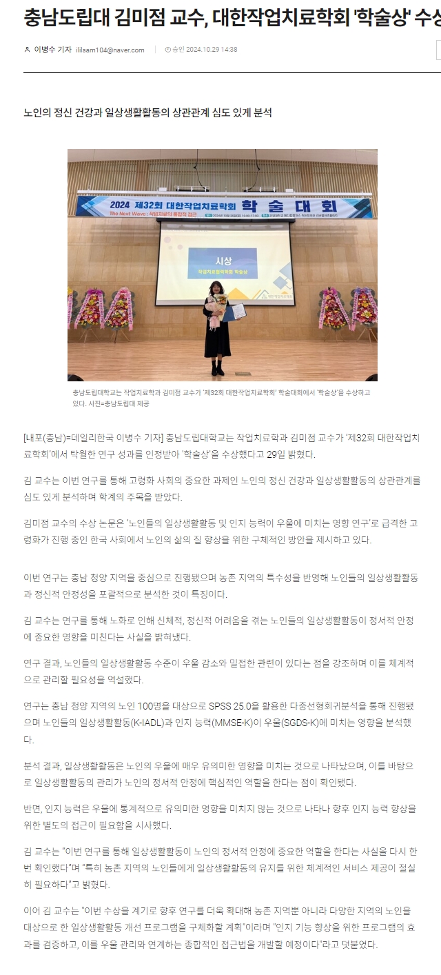 충남도립대학교는 작업치료학과 김미점 교수가 ‘제32회 대한작업치료학회’에서 탁월한 연구 성과를 인정받아 '학술상'을 수상했다고 29일 밝혔다.