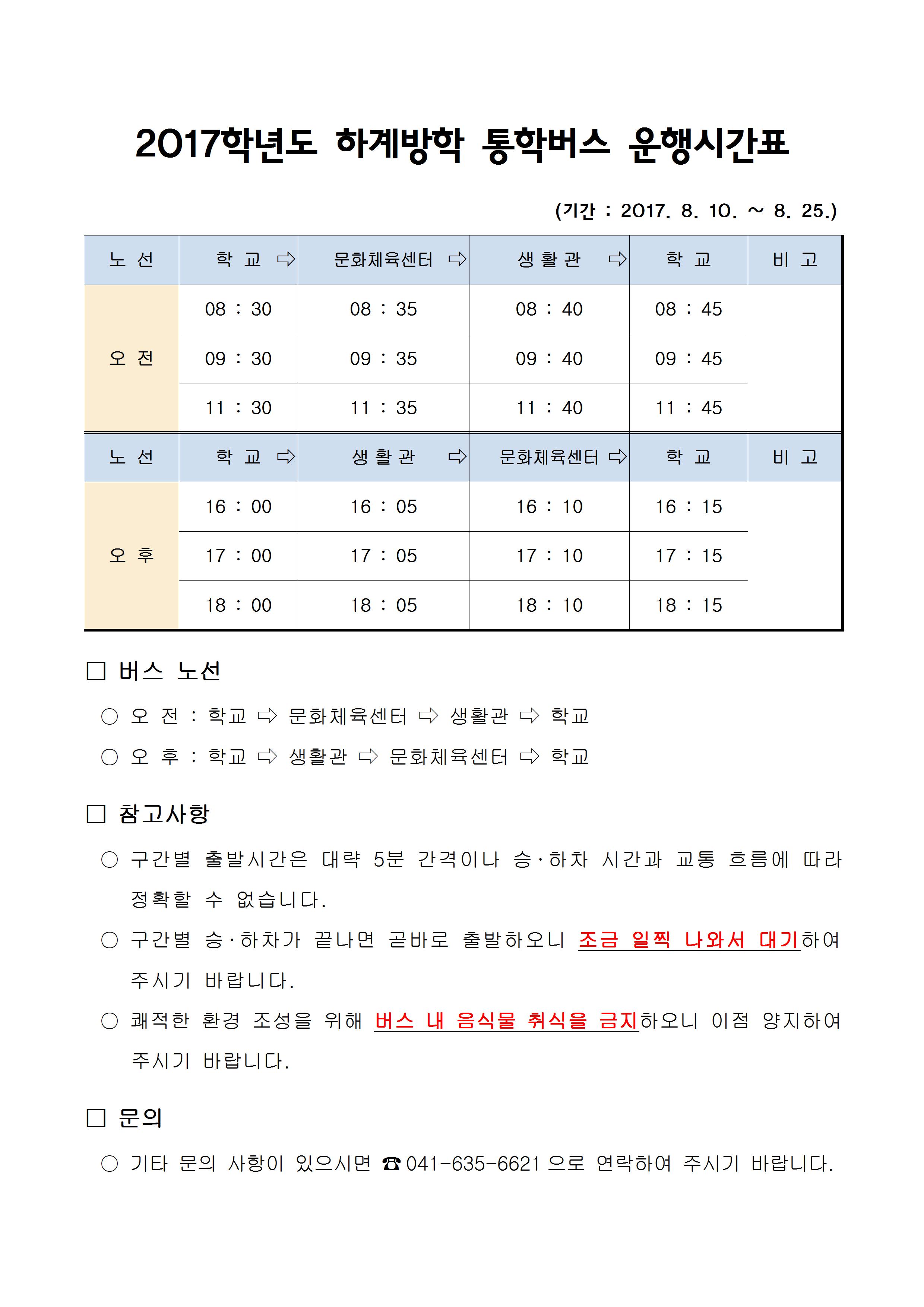 2017학년도 하계방학 통학버스 운행시간표 알림 (2차)
