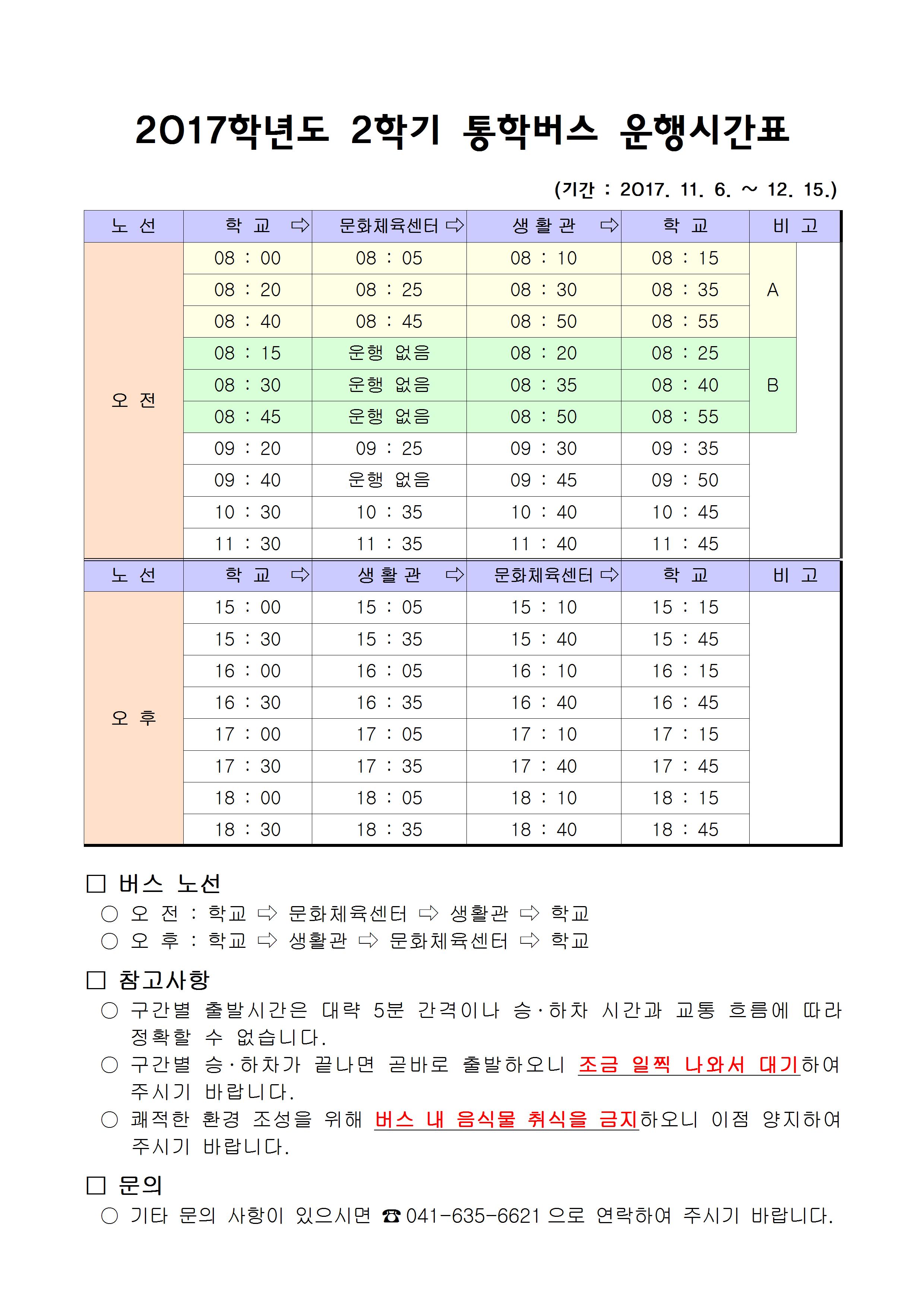 2017학년도 2학기 통학버스 운행시간표가 붙임과 같이 변경되었으니 이용에 착오없으시기 바랍니다.