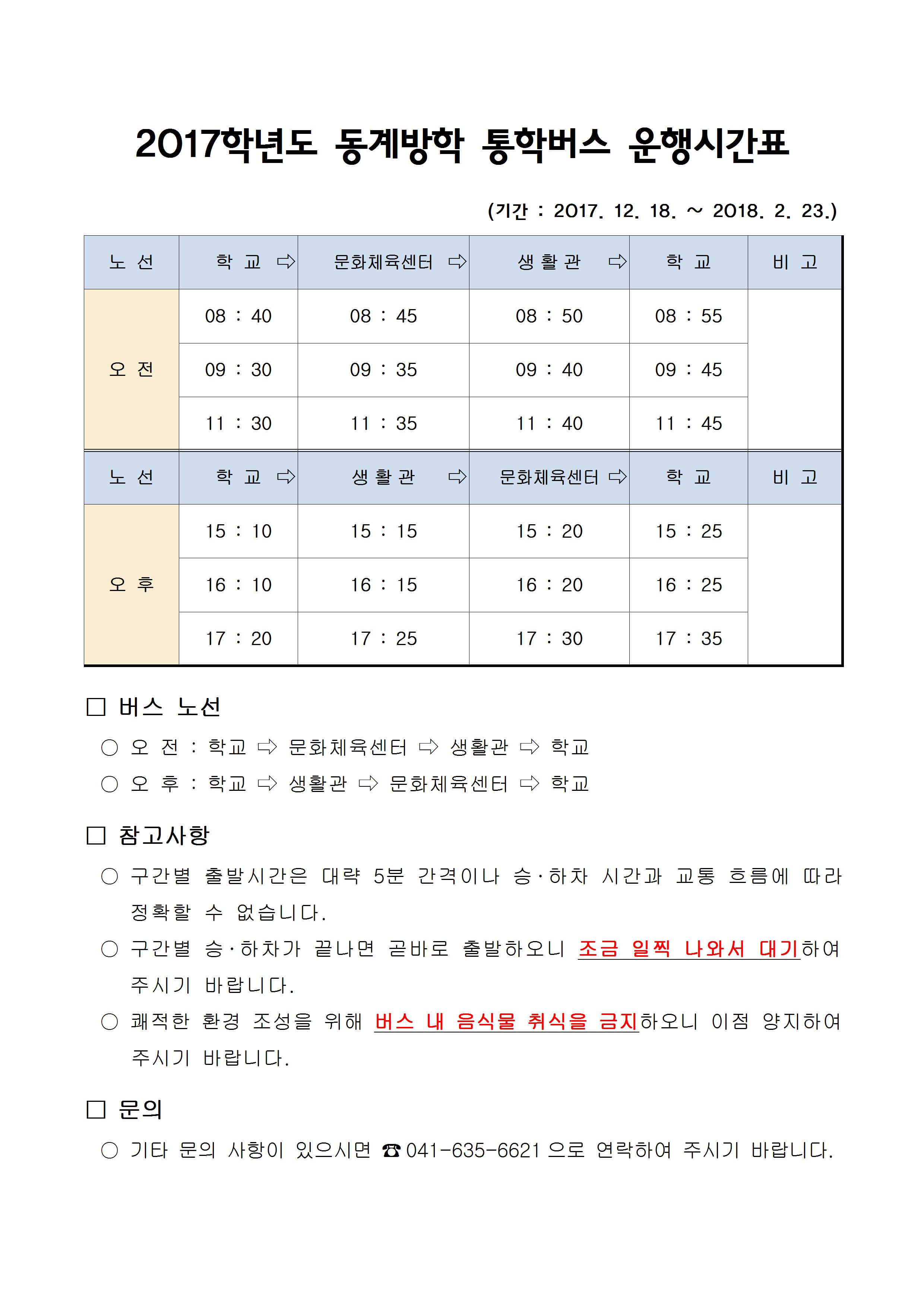 2017학년도 동계방학 통학버스 운행시간표가 붙임과 같이 알려드리오니 이용에 착오없으시기 바랍니다.