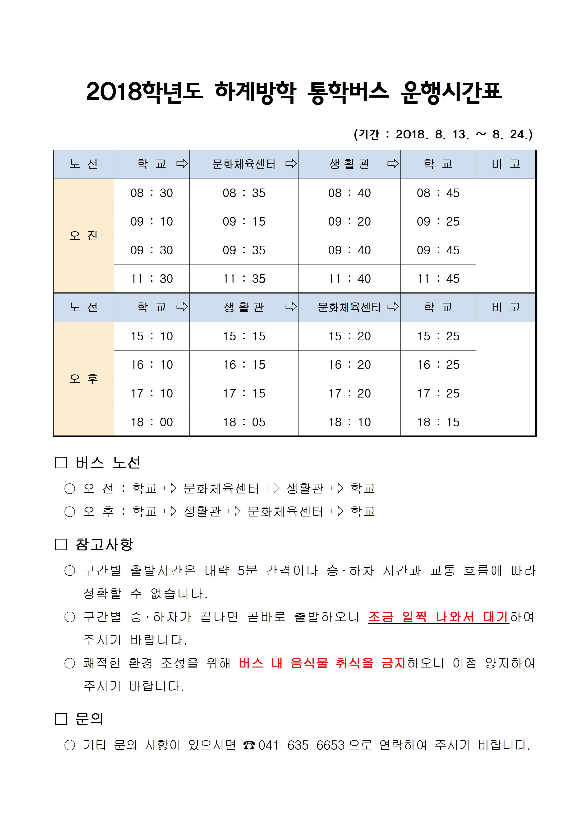 2018학년도 하계방학 통학버스 운행시간을 붙임과 같이 알려드립니다.