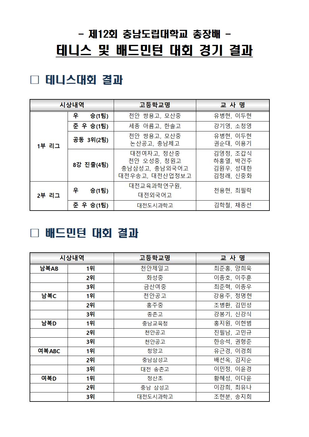 제12회 총장배 테니스 및 배드민턴 대회 경기 결과 알림