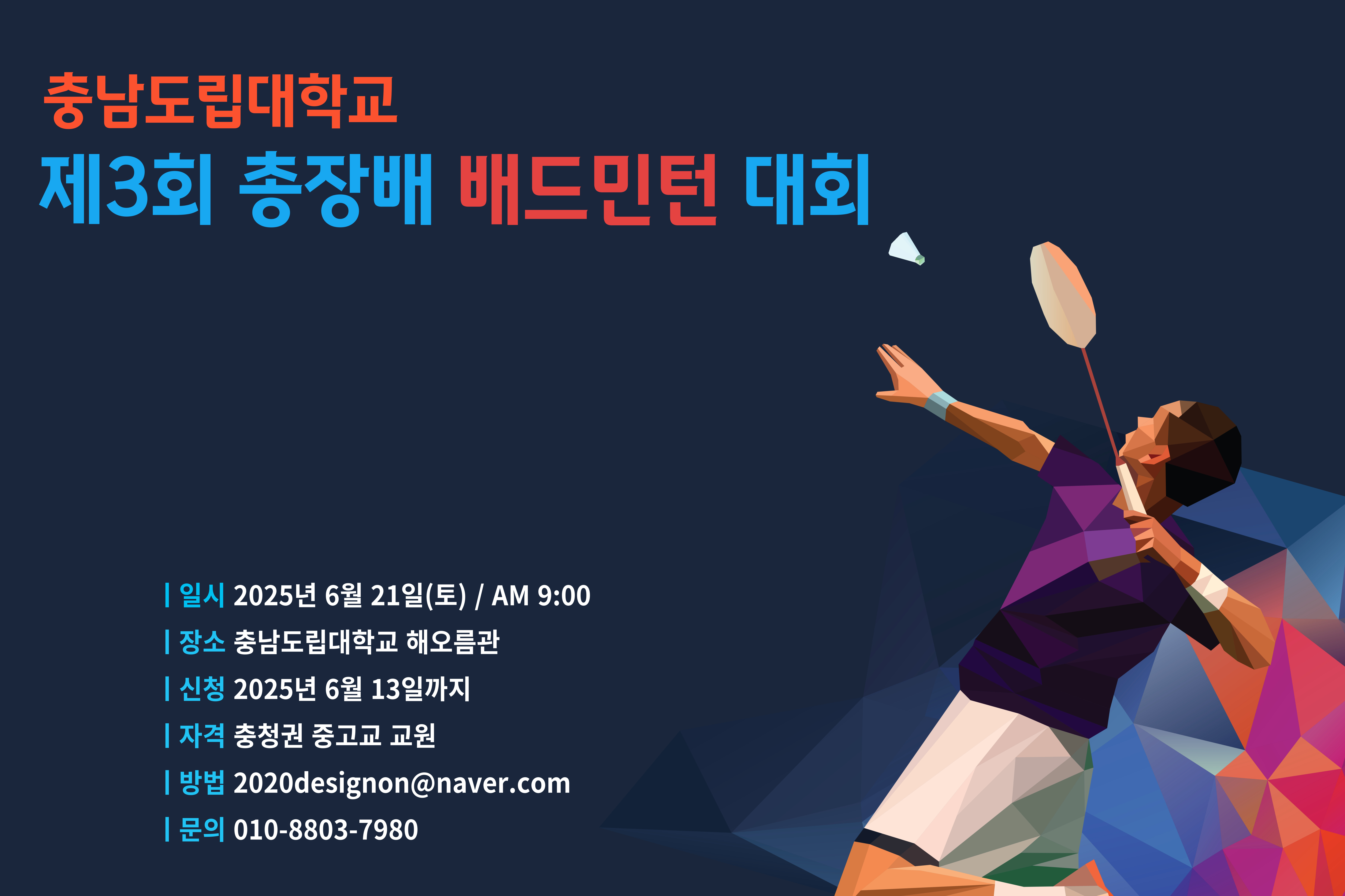 충남도립대학교가 충청지역 중‧고등학교 교원 여러분의 화합과 친목을 도모하고자 테니스 및 배드민턴 대회를 개최합니다.